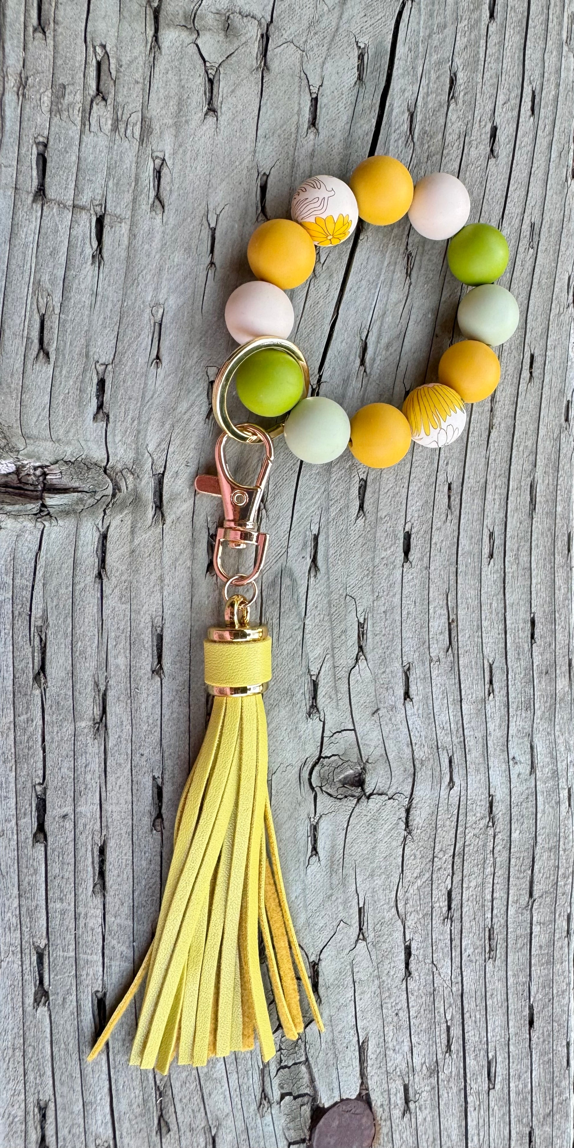 Materials: silicone, leather tassel, gold metal keychain.